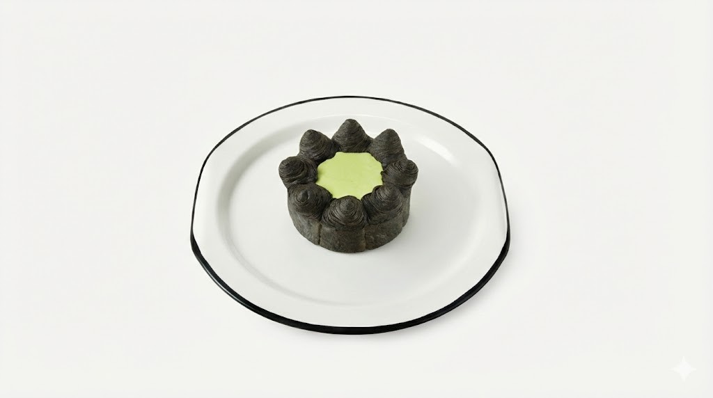 피크(Peak) 케이크: 누데이크의 영원한 시그니처! 먹물 페이스트리 안에 진한 말차 크림이 용암처럼 흘러내리는 비주얼은 언제 봐도 독특한 감상을 줍니다.